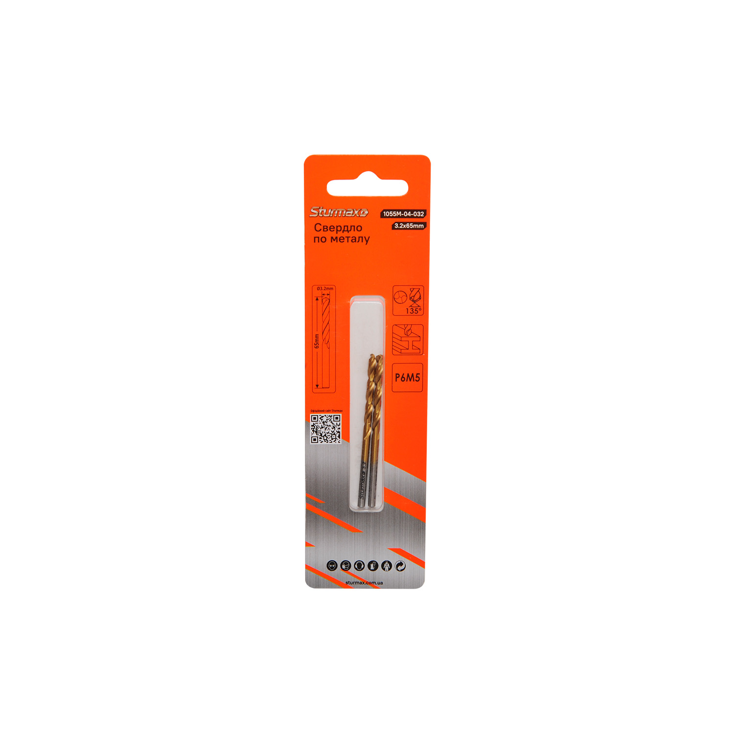 Sturmax 1055M-04-032 – свердло по металу діаметром 3.2 мм. Призначене для свердління глухих і наскрізних отворів у вуглецевих і легованих сталях, кольорових металах та пластиках. Свердло виготовлене зі швидкорізальної сталі Р6М5, що забезпечує високу зносостійкість, стійкість до перегріву та тривалий термін служби за умов підвищених навантажень. Кут заточування 135° сприяє покращеному самоцентруванню, зниженню осьового зусилля та підвищеній стабільності під час свердління отворів у твердих і в’язких матеріалах. Оптимальна геометрія ріжучої частини забезпечує рівний хід свердла, ефективний відвід стружки та високу якість обробки отворів. Поставляється в упаковці по 2 штуки.