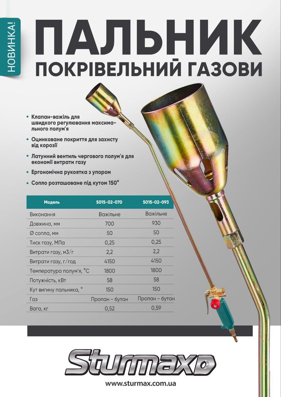Sturmax 5015М-02-093 – покрівельний газовий пальник довжиною 930 мм. Потужність – 58 кВт. Робоча температура полум’я – 1800 °C. Призначений для нагрівання та наплавлення покрівельних і ізоляційних матеріалів, а також для виконання монтажних і будівельних робіт, що потребують інтенсивного теплового впливу. Оснащений спеціальним важільним клапаном, який забезпечує швидке регулювання максимального полум’я. Латунний вентиль чергового полум’я дає змогу налаштувати мінімальний рівень полум’я, сприяючи економній витраті газу. Робочі елементи мають оцинковане покриття, що надійно захищає від корозії. Ергономічна рукоятка з упором підвищує зручність утримання та точність спрямованого нагріву. Сопло діаметром 50 мм розташоване під кутом 150°, що забезпечує рівномірний розподіл полум’я. Працює на пропан-бутановій суміші.