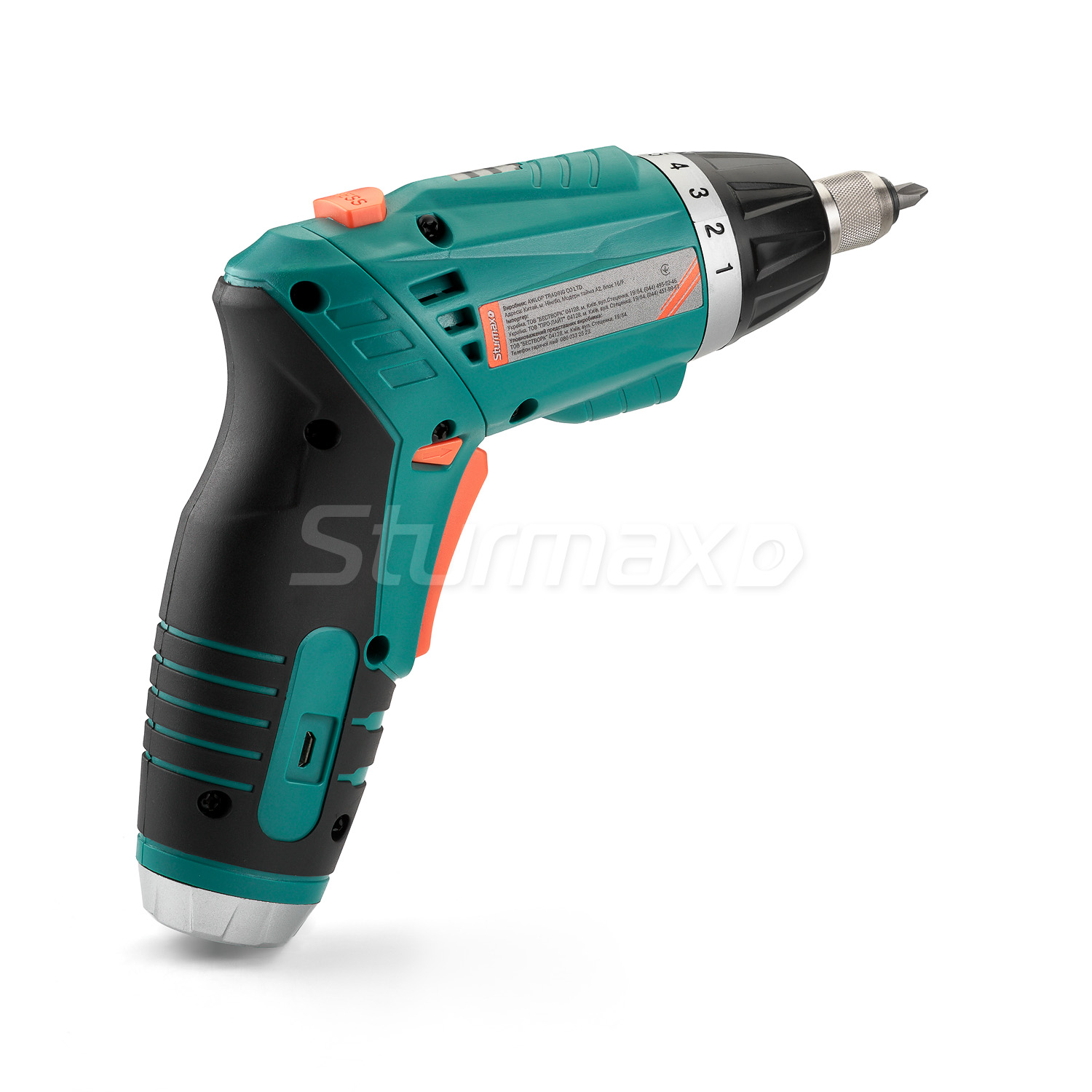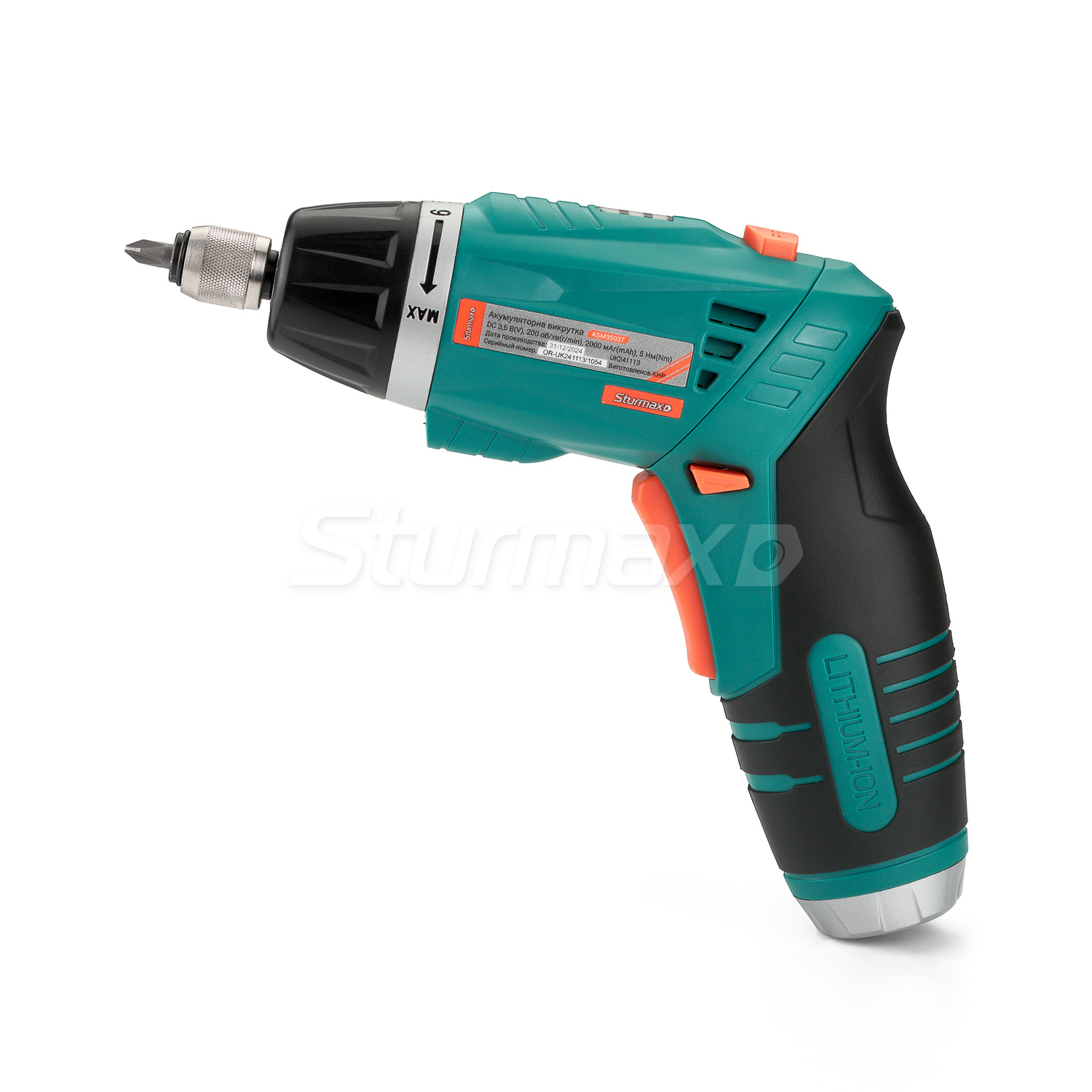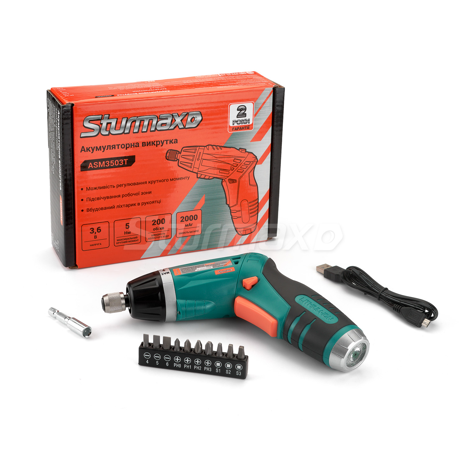 Sturmax ASM3503T – універсальна 3.6В акумуляторна викрутка. Призначена для виконання дрібних монтажних, складальних і кріпильних робіт з використанням гвинтів, саморізів, шурупів в умовах обмеженого простору. Модель виконана в трансформованому корпусі: поворотний механізм дає змогу швидко змінювати конфігурацію з прямої на пістолетну, забезпечуючи максимальну зручність користування. Викрутка оснащена регулюванням зусилля затягування і функцією реверсу. Швидкозатискний патрон полегшує заміну насадок, а подвійна система освітлення: світлодіод під патроном і вбудований у торець рукояті ліхтар – сприяє комфорту використання при слабкому зовнішньому світлі. Прогумовані накладки на рукояті покращують контроль і підвищують надійність хвата.