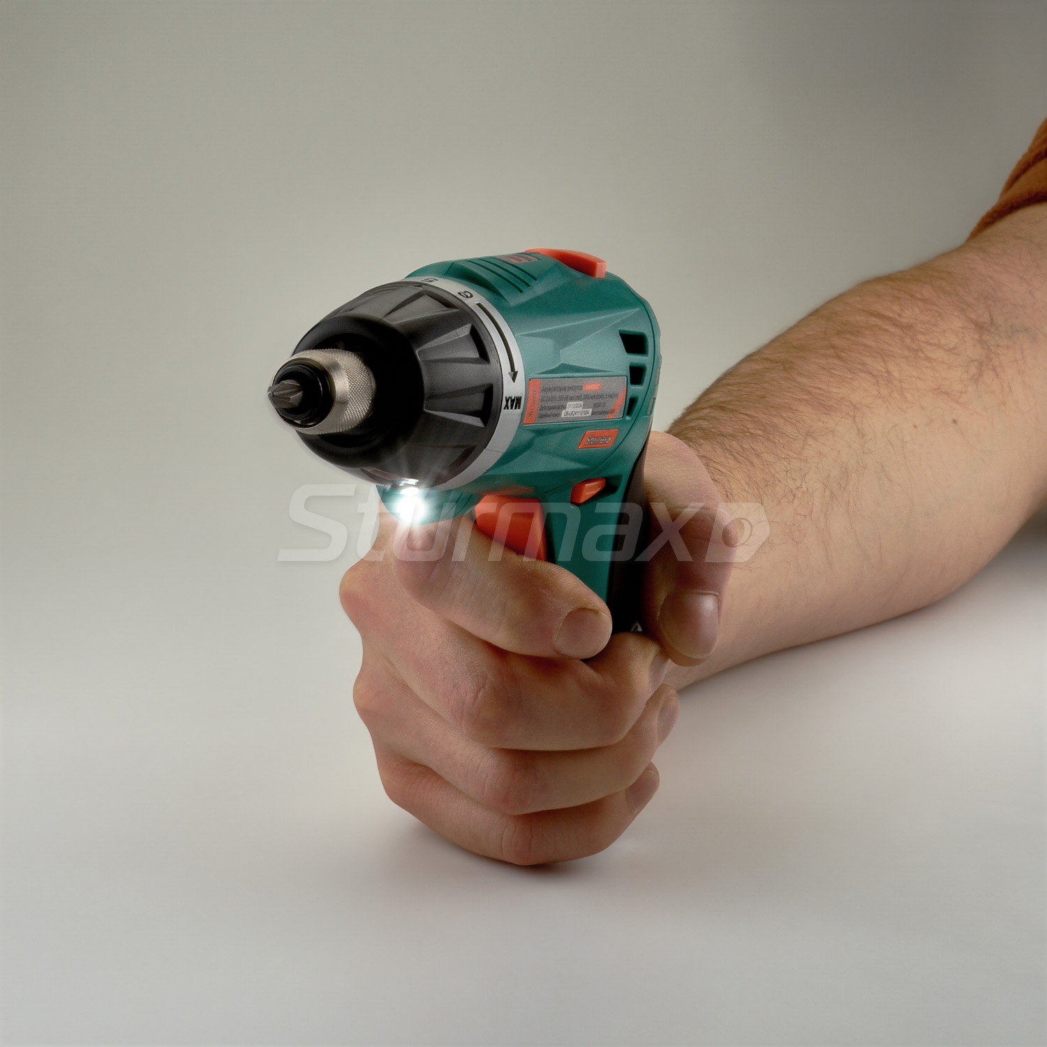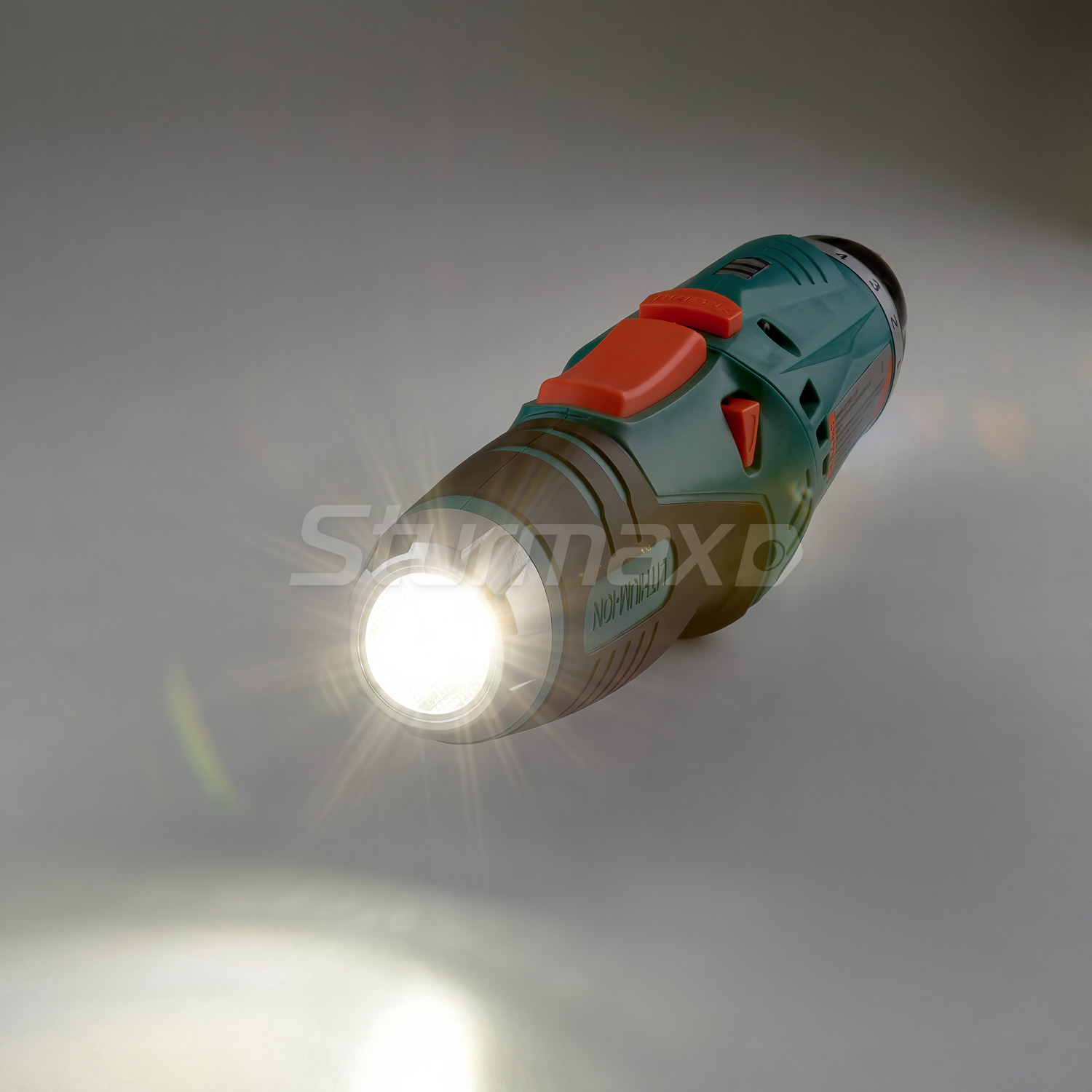 - Вбудований в рукоять ліхтар – дає змогу додатково використовувати акумуляторну викрутку як освітлювальний прилад.
