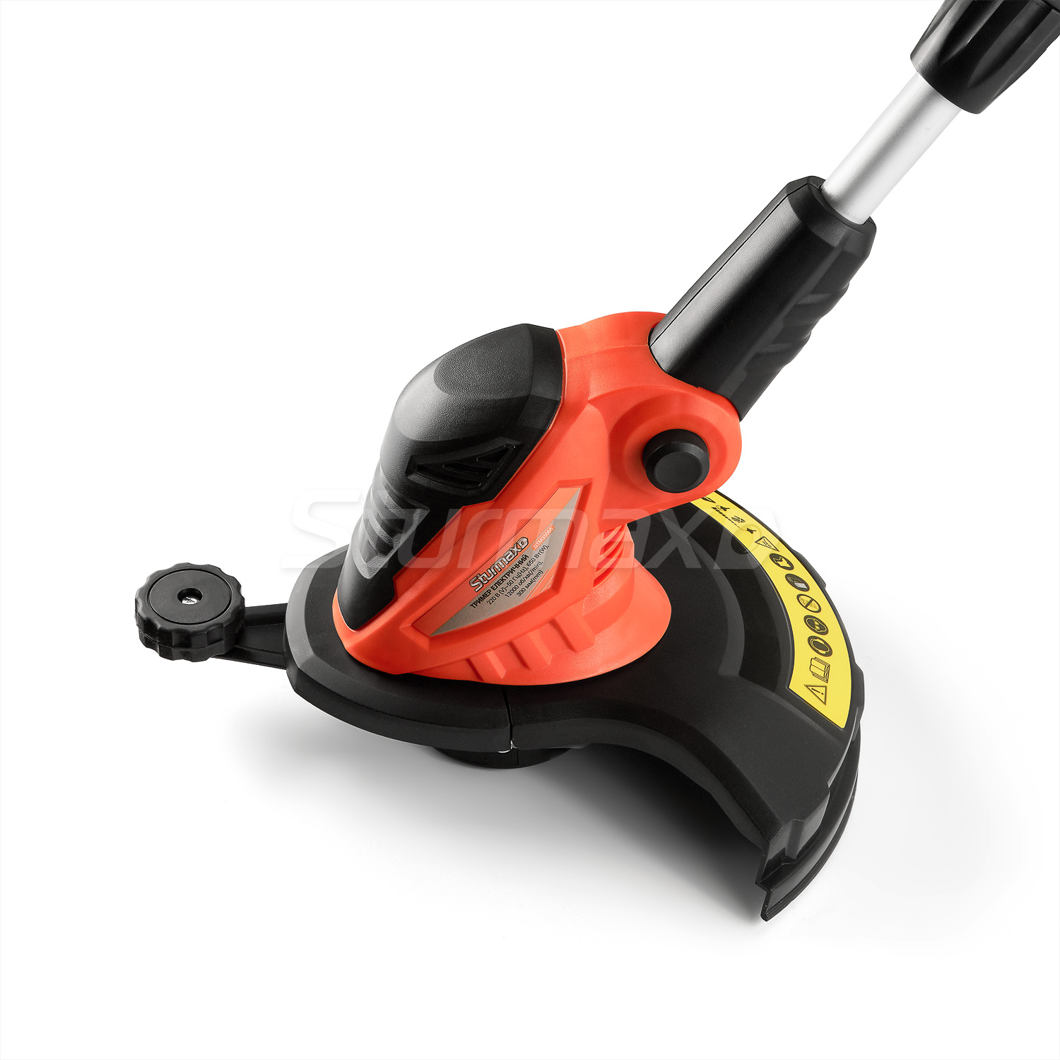 Sturmax GTM35065 – сучасний та ергономічний електричний тример – призначений для очищення садових та присадибних ділянок невеликої площі від трави та бур’янів, фінішної обробки газонів. Має компоновку з нижнім розташуванням двигуна – така конструкція, порівняно з тримерами класичної компоновки, забезпечує вищий ККД завдяки меншим механічним втратам. Важливою перевагою тримера є його мобільність – мала вага та невеликі габарити дозволяють ефективно використовувати інструмент для скошування трави в умовах обмеженого доступу, де неможливо застосувати колесну газонокосарку. Завдяки наявності спеціального опорного колеса модель чудово пристосована для підрізання кромок. Додатковий комфорт при роботі забезпечує можливість зміни положення триммерної головки відносно штанги без допоміжного інструмента – достатньо лише натиснути кнопки регулювання нахилу з обох боків тримера та зафіксувати потрібне положення. Особливою рисою Sturmax GTM35065 є низький рівень шуму, завдяки чому тример може експлуатуватися в місцях з обмеженнями по шумності: в житлових зонах, лікарнях, школах тощо. Модель оснащена 650 Вт електродвигуном, який розвиває максимальну частоту обертання шпульки з ліскою до 12000 об/хв, що гарантує високу ефективність та якість роботи. Ширина скошування за один прохід становить 300 мм. Інструмент максимально простий в освоєнні та роботі і не потребує спеціальних навичок. Має відмінну ергономіку: оптимально розташована кнопка пуску має великий розмір та не потребує звикання, D-подібна рукоятка сприяє надійності хвата та кращому контролю в процесі роботи, алюмінієва телескопічна рукоятка дозволяє змінювати довжину інструмента в широкому діапазоні, що дає змогу налаштувати тример під зріст користувача. Для надійної фіксації подовжувача на корпусі передбачений спеціальний зачіпний гачок.