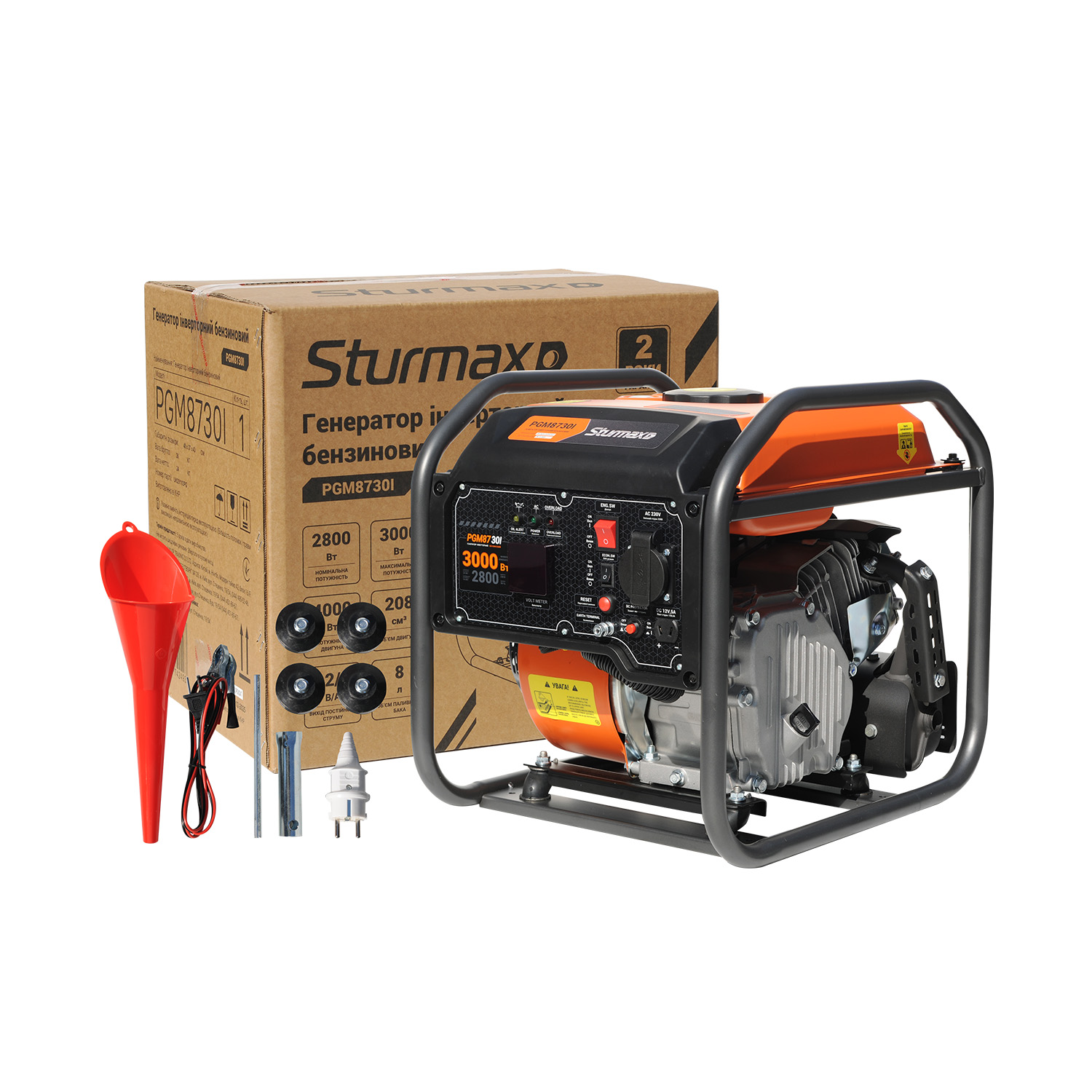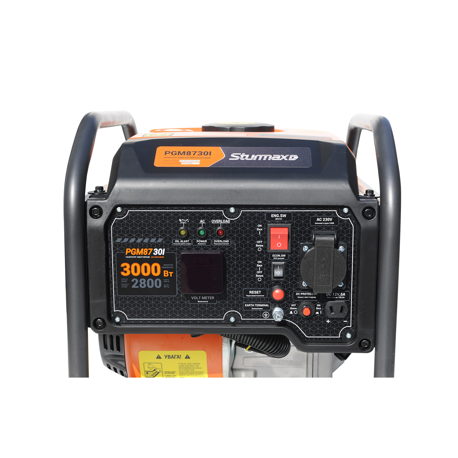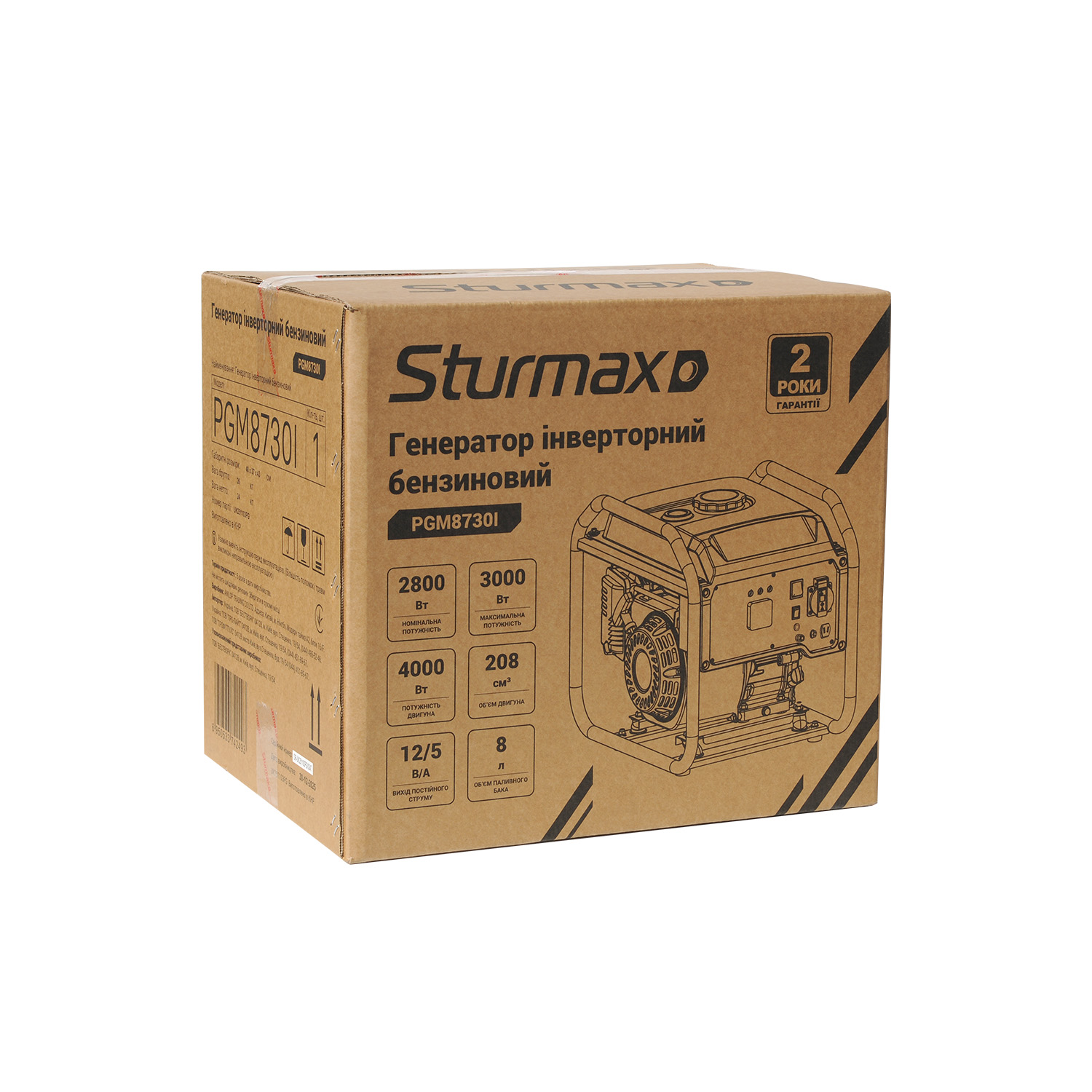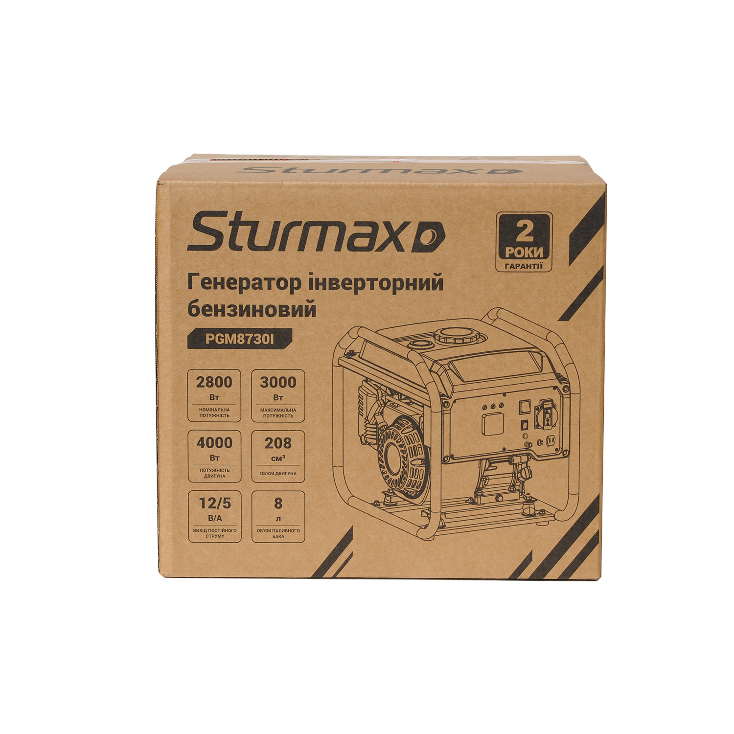 Sturmax PGM8730I – однофазний інверторний бензиновий генератор для резервного або тимчасового електропостачання. Оснащується чотиритактним верхньоклапанним (OHV) двигуном повітряного охолодження LT170F робочим об’ємом 208 см3 який характеризується низьким рівнем шуму. Завдяки інверторному перетворювачу напруги гарантується максимальна стабільність роботи – генератор інверторного типу, на відміну від синхронного, здатний підтримувати постійну напругу незалежно від обертів двигуна та відмінно підійде для живлення чутливої електроніки: комп’ютерної техніки, смартфонів, медичних пристроїв тощо. Модель обладнана спеціальним електронним модулем, який дає змогу користувачеві контролювати основні параметри роботи – дані відображаються на цифровому дисплеї. Генератор має систему захисту від перевантаження, яка примусово вимикає агрегат у разі перевищення допустимого навантаження або короткого замикання, а також оснащений системою аварійної зупинки двигуна в разі критично низького рівня масла. Тип запуску – за допомогою ручного стартера.