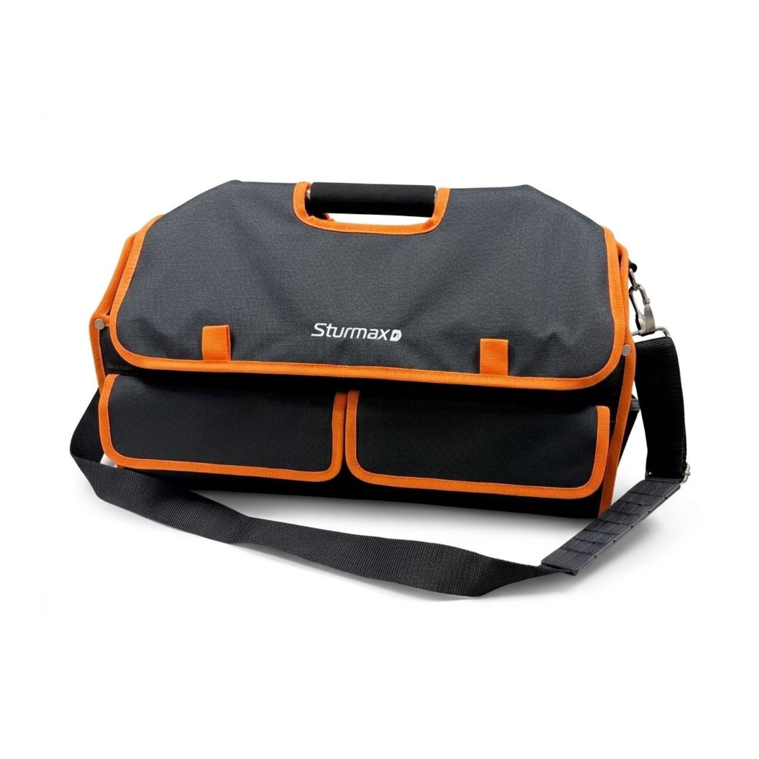 Sturmax TBM170 — універсальна 16″ сумка для інструментів з металевою ручкою. Габаритні розміри — 420x260x310 мм. Призначена для зручного зберігання, організації та транспортування ручного інструменту та оснастки. Головною особливістю моделі є міцна металева рукоять з м’якою накладкою, яка забезпечує надійний хват і комфорт при перенесенні важкого інвентарю. Сумка виготовлена з високоміцного зносостійкого матеріалу, стійкого до механічних пошкоджень. Продумана конструкція з безліччю зовнішніх і внутрішніх кишень дозволяє раціонально розподілити інструменти, забезпечуючи до них швидкий доступ. Жорсткий каркас допомагає виробу зберігати форму, а наявність плечового ременя дає можливість звільнити руки при транспортуванні.